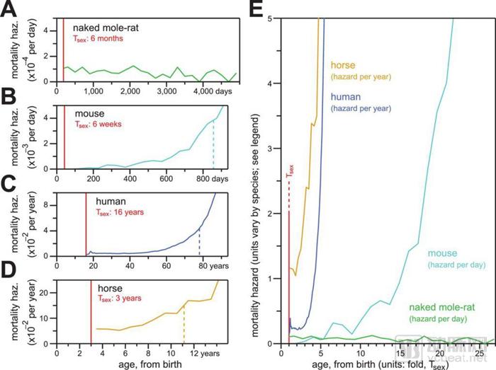 在衰老过程中,裸鼹鼠死亡率的稳定性与其他哺乳动物不同
