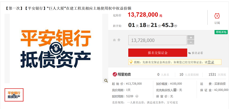 从阿里拍卖网站上获悉,平安银行即将通过阿里拍卖平台转让“巨人大厦在建工程及相应土地使用权中权益价值的6.8958%份额”,拍卖将于11月28日启动,起拍价为1372.8万元。