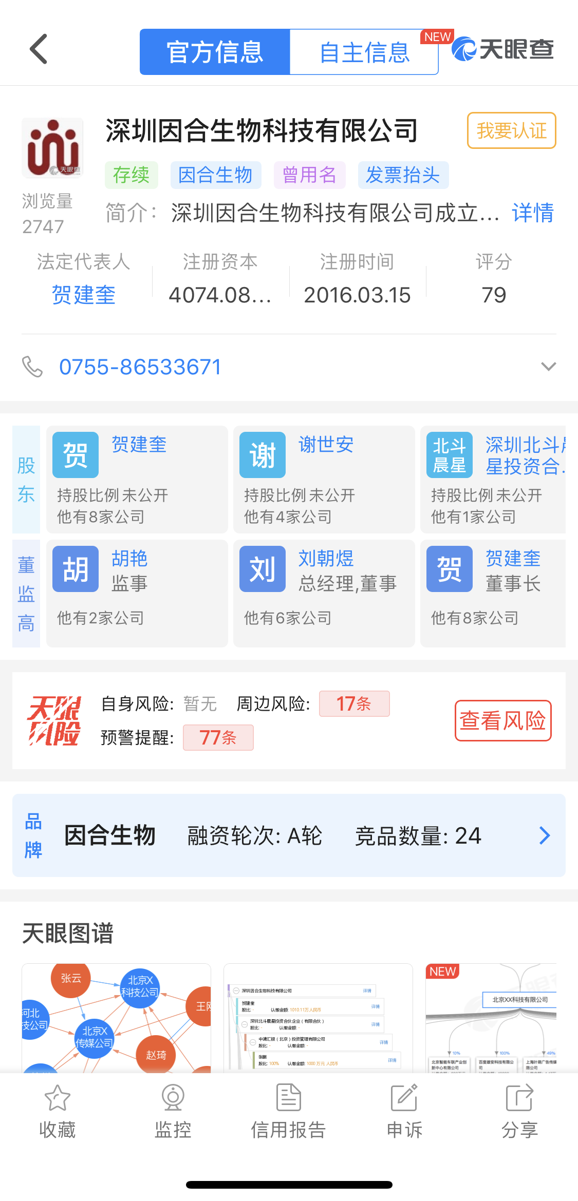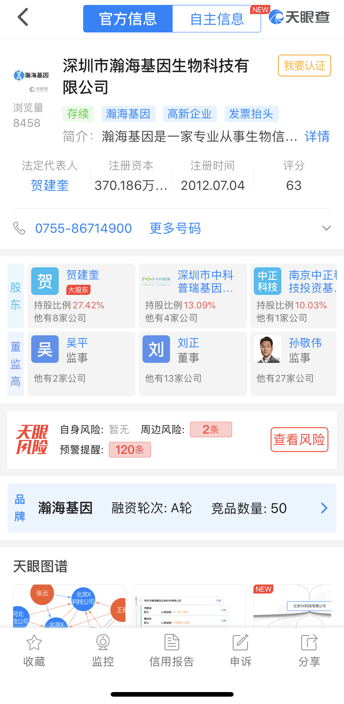 工商资料显示,贺建奎目前在8家基因相关公司参股或任高管,主要包括深圳因合生物科技有限公司(以下简称“因合生物”)及其几个子公司、深圳市瀚海基因生物科技有限公司(以下简称“瀚海基因”),深圳市南科生命科技有限公司、深圳市瀚海创业投资管理合伙企业(有限合伙),综合此前报道和知情人士消息,大致可确定因合生物与瀚海基因为其主要的企业。