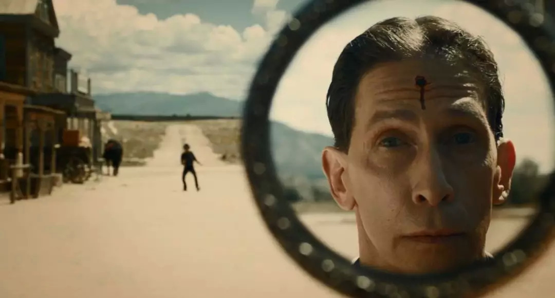 在这个故事中,科恩以极其流畅的剪辑,欢快的配乐,精确无比的站位,迅速交代完了全片的四场枪战。这里把死亡包装成了一个极具黑色幽默风格的冷笑话,画风血腥却畅快无比,可谓是暴力美学的典范之作,也是典型的类似昆汀式西部片拍法。