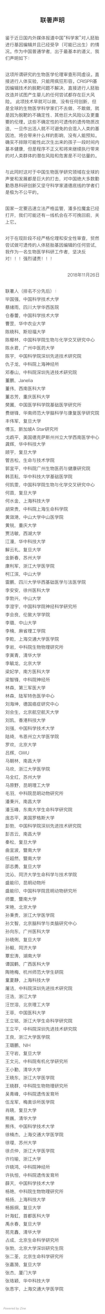 122位科学家在新浪微博“知识分子”账号上发布联合声明,对“首例免疫艾滋病基因编辑婴儿”进行强烈谴责。