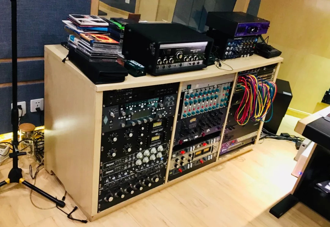 响鼓的设备并没有特别稀有或者昂贵的,柜子左侧这磁带 Delay 是卢楠从日本背回来的,声音非常有特色,但是能用的地方也很少