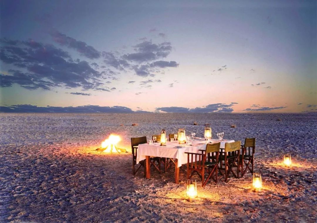 夜晚在无边无垠的盐沼中央享用烛光晚宴,又是有别于草原,海滩的另一种感觉,不变的是日落余晖与繁星闪耀的永恒陪伴。