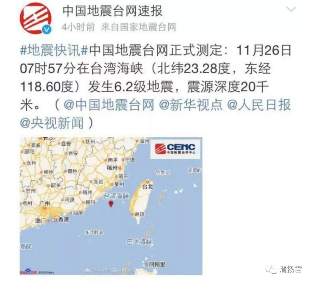 2018年7时57分,台湾海峡发生了地震6.2级地震;之后8时15分和10时55分再次发生3.6级、3.4级余震。