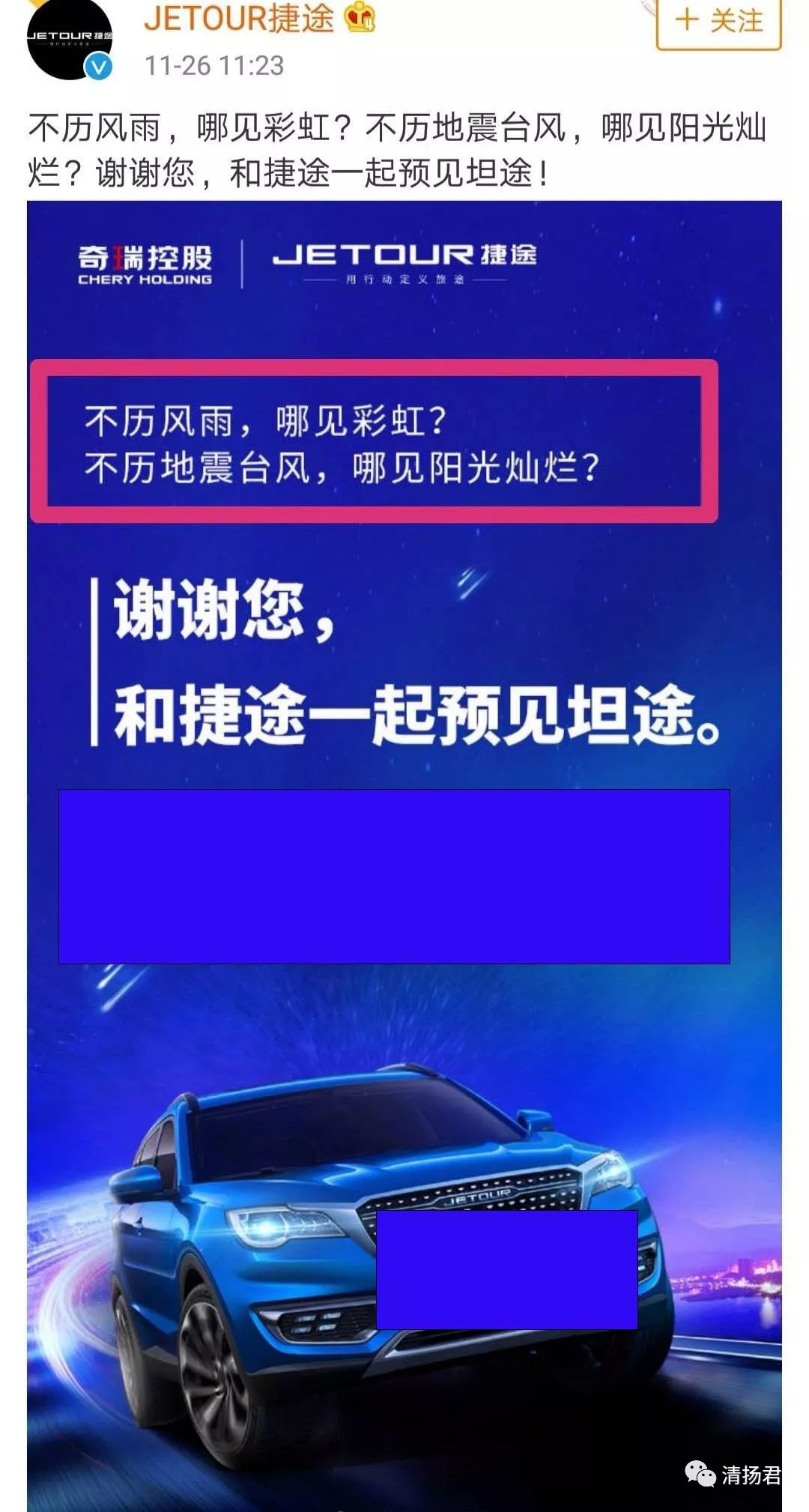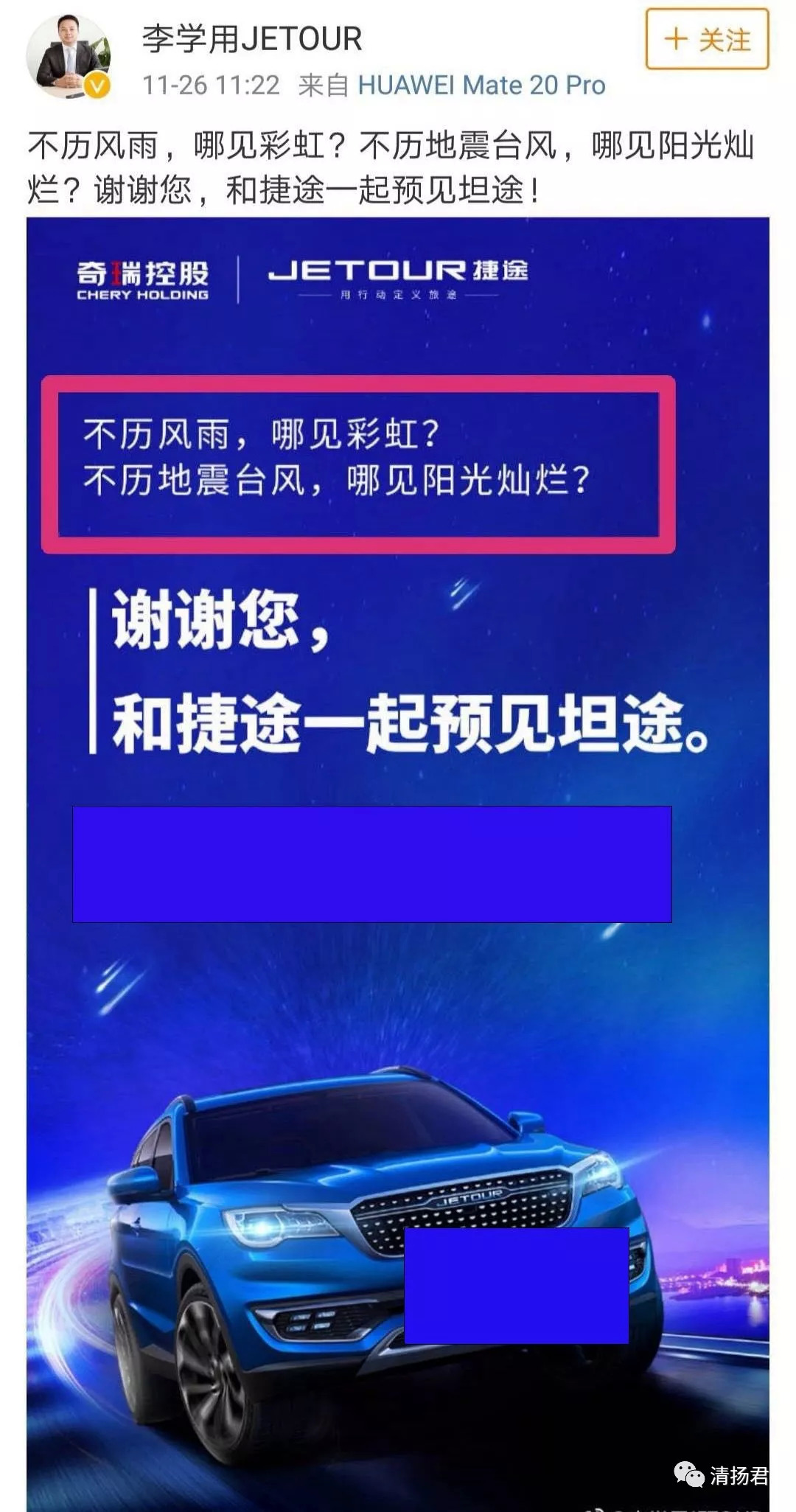 就在大家恢复正常生活的时候,11点22分和23分,微博认证“奇瑞控股集团JETOUR捷途营销中心总经理”的“李学用JETOUR”和“奇瑞控股集团JETOUR捷途官方微博”先后发布了“不历风雨,哪见彩虹?不历地震台风,哪见阳光灿烂?谢谢您,和捷途一起预见坦途”的发布会预告。
