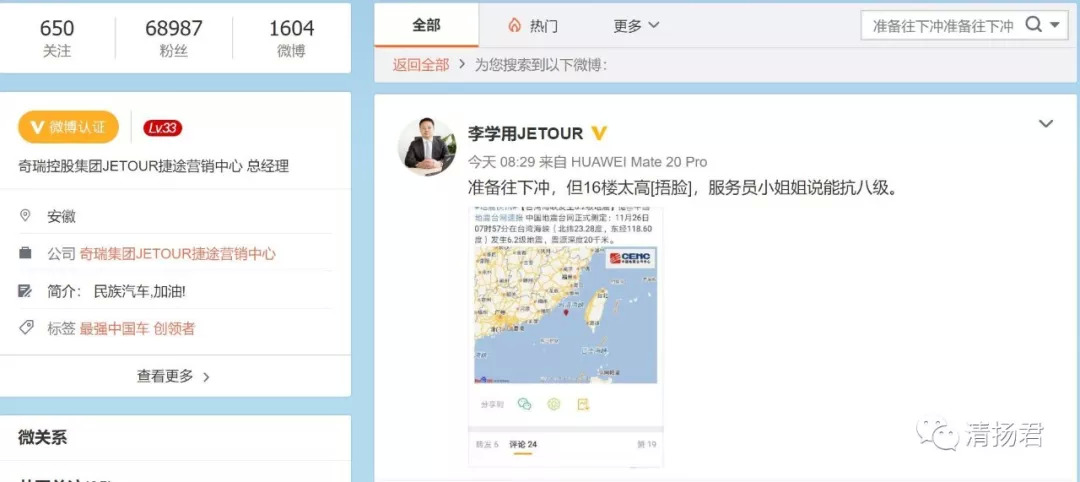 如果说捷途公司和李学用不知道地震还好解释一点,偏偏上午8点29分,李学用发布了“准备往下冲,但16楼太高,服务员小姐姐说能抗八级。”的微博。翻阅李学用的微博,可以推测他本人应该就在厦门。