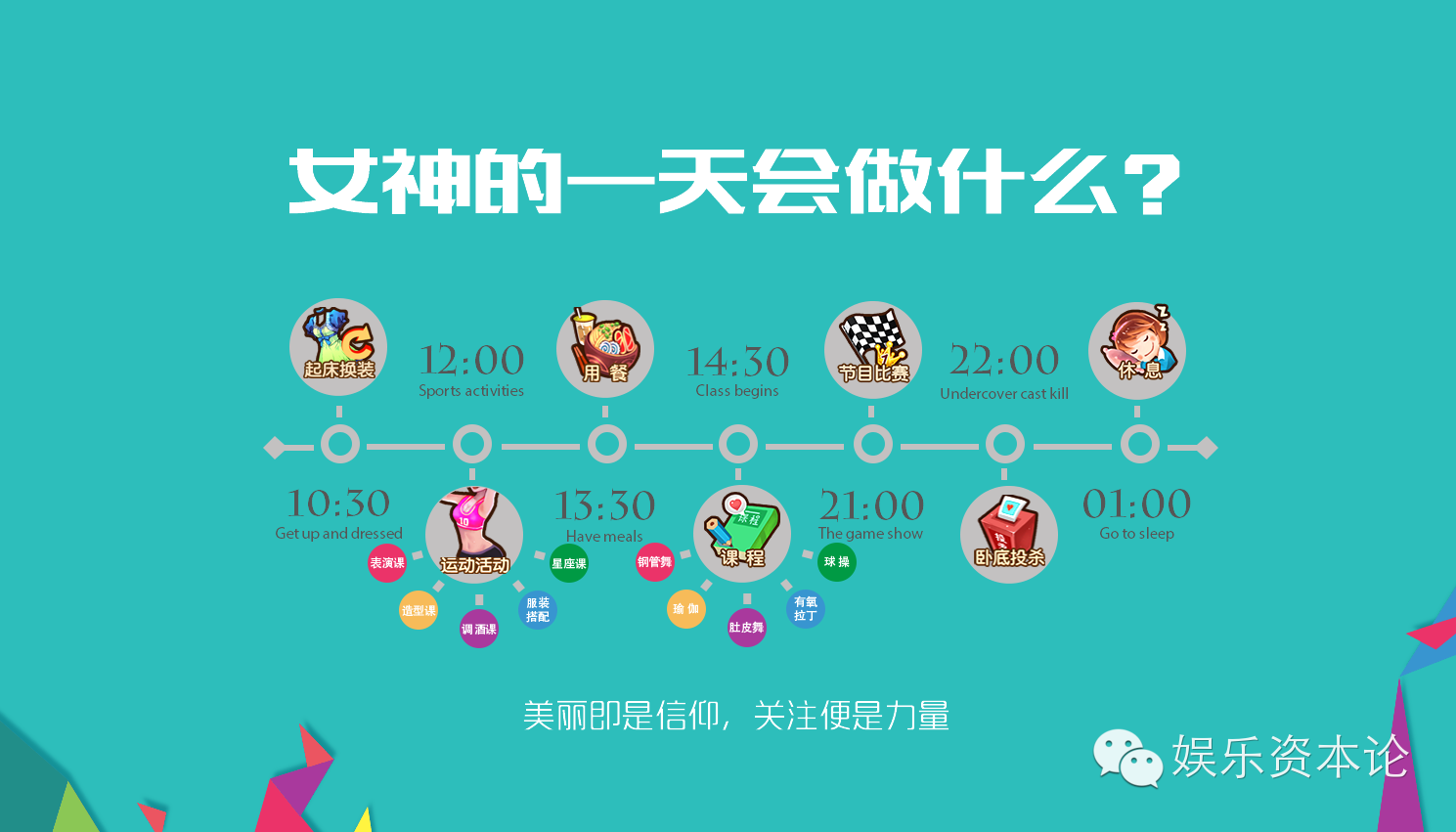 下面,小娱特意找了该节目的幕后大佬、爱奇艺前产品总监高玮和他的玩乐云,从主线安排、真人秀设计、投入回收等方面分析一下这个节目,或许,下一个EA这样的跨媒体娱乐集团,也会在这种类型的节目里面产生。而电视台的传统综艺人,是不是现在仍浑然不觉呢?主线故事:老大哥节目的主线故事是这样的:每位女神在进入《女神的房间》之初会携带十万元的“梦想基金”,在这十位女生当中会有一名“卧底”。她们每天结束一天的直播之前会到一个房间中投出自己最不喜欢的一个人。当天累计票数最多的三个人会扣掉一万“梦想基金”。当某位女生的“梦想基金”被全部扣光之后,她将会出局,会有新的女神补位。