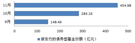 近期,市场持续低迷,利率下降有利于债市的回暖,助推债券型基金业绩。Wind数据显示,截至11月25日,9月至11月债基新发行份额逐月递增,分别为148.46亿份、284.16亿份、454.98亿份;占单月新发行总额比例分别为72.11%、66.34%、99.15%,市场上接近85%的基金取得正收益。
