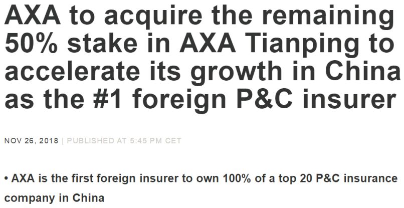 法国安盛于法国当时时间26日下午5:45,也即中国时间27日凌晨1时左右宣布了上述消息,称此次收购将加快其在中国的发展。
