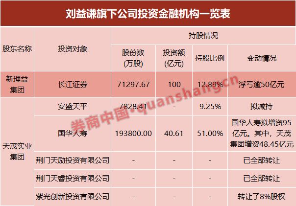 据披露,刘益谦旗下的新理益集团对天茂集团的持股比例为37%,刘益谦和其夫人王薇分别持股天茂集团17.2%和11.25%,共计持股65.45%。其中,新理益集团持有长江证券12.89%股份,为其第一大单一股东;天茂集团持有国华人寿51%的股权和安盛天平9.25%股权。