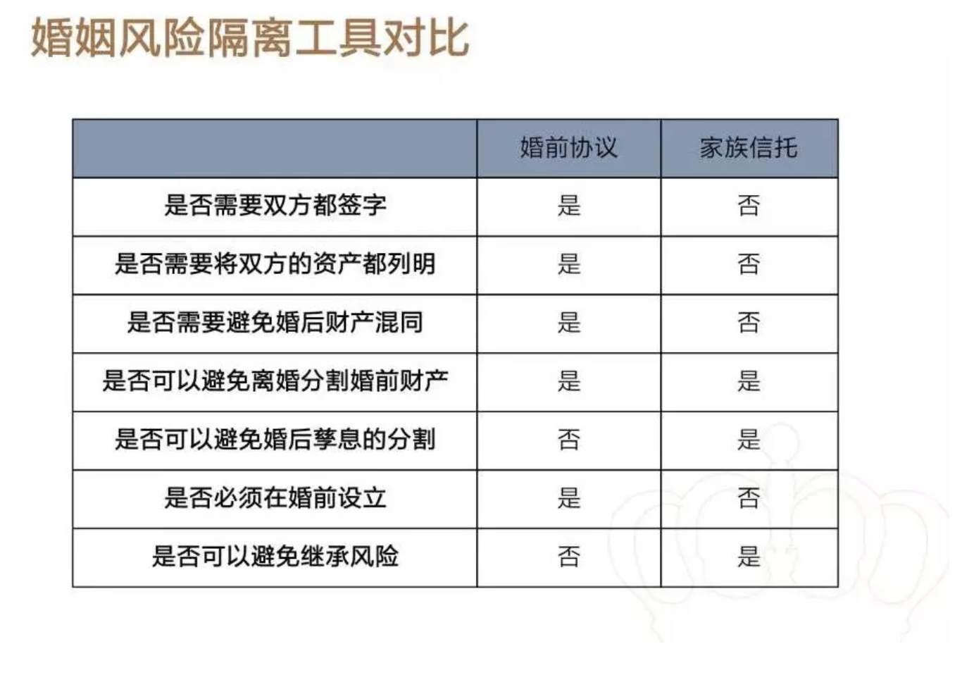 从婚姻风险隔离工具来看,上面这张图表清楚的显示出家族信托与婚前协议的对比,可以看出,无论是便捷性、安全性、保密性、传承性等方面,家族信托都能起到天然“防火墙”的重要作用,从而有效的保障和传承财富。洛克菲勒家族、李嘉诚家族、新鸿基郭氏家族、潘石屹家族等都不约而同的选择了家族信托这一法宝,实现了财产安全隔离、财富灵活传承、税务规划、信息保密等多方面需求。