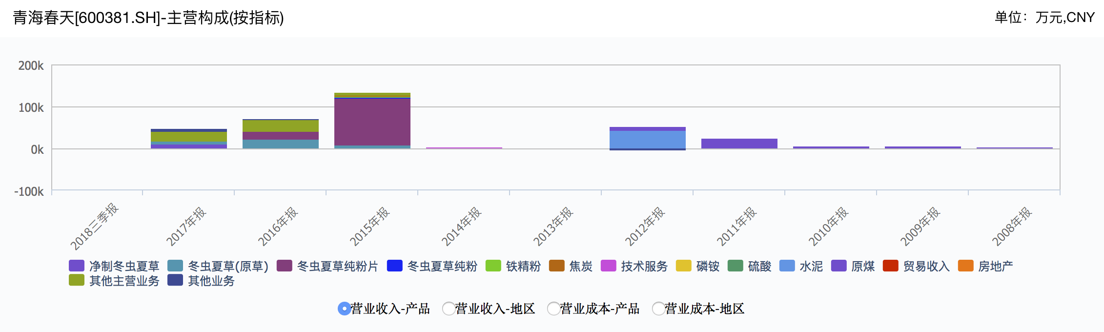2016年2月,原国家食品药品监督管理部门终止了冬虫夏草作为保健品的试点工作。2016年3月底,青海春天冬虫夏草纯粉片停产。2016年,冬虫夏草纯粉片的营收从11.17亿元下降到1.87亿元。当年青海春天营收为7.08亿元,同比下降49.48%,净利润为2.45亿元,同比下降31.49%。
