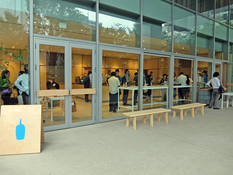 此前Blue Bottle在精品咖啡浪潮中作为新秀迅速走红,除了咖啡品质,多少是由于Blue Bottle区别于星巴克等商业连锁咖啡店之外的空间和店铺设计:无修饰的、粗犷的墙面,全开放式的咖啡制作柜台,店铺内的座位设置等等,是与商业连锁咖啡店气氛不同、更具生活感的第三空间。在日本,六本木、清澄白河等地的Blue Bottle门店甚至不会在门店内设置wifi与很多插座,目的便是为了让人们在门店专注咖啡和沟通本身。