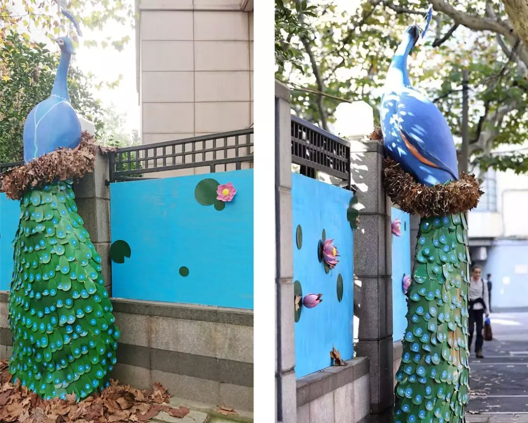 还有一只孔雀来给美景增光添彩。无论你见过人间多么美丽动人的孔雀,但绝对没见过这样,穿着内裤的孔雀。注意,墙上的荷花能突破万有引力生长呢~