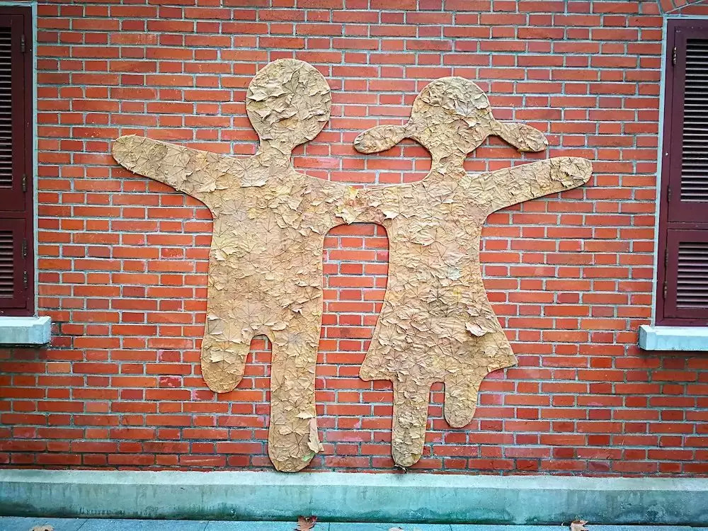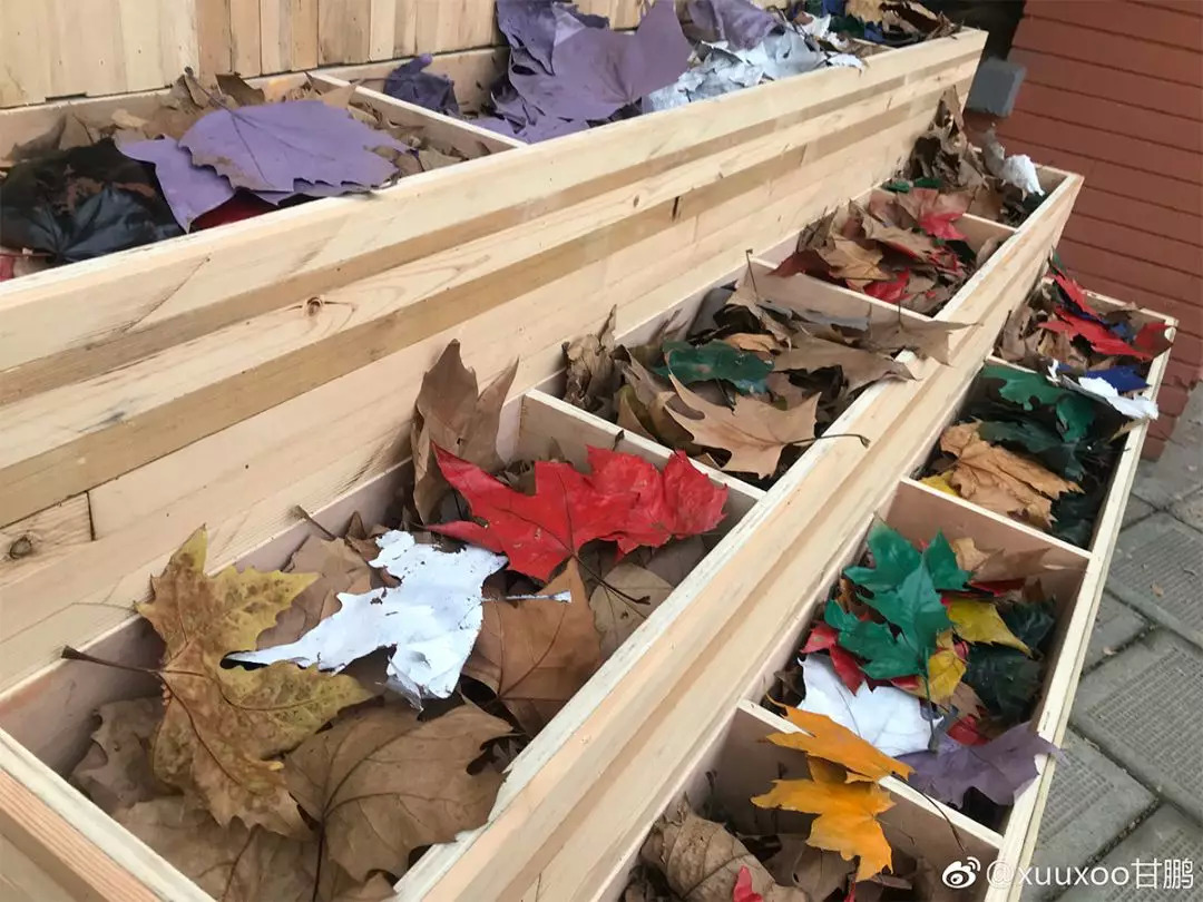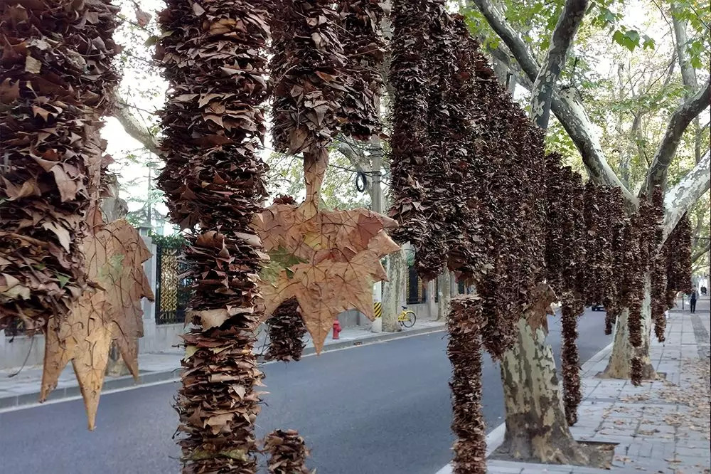 看似肤浅,但是艺术家把这些看起来谁都能做的装置上贴满了落叶,就一下子跟主题联系到一起了呢。