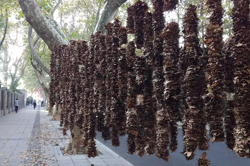 这是“秋叶”,不是腊肉在风干,据说设计者是想留住落叶下落的瞬间,有点像延迟摄影。