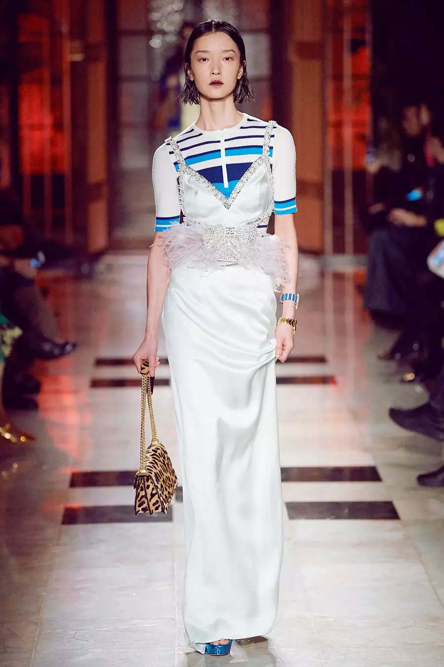 还有杜鹃这套,V领钻饰绸面白色长裙,腰边有蓬蓬的鸵鸟毛装饰,内搭了件运动风紧身针织衫,好像在告诉我:不露才是种高级的性感。