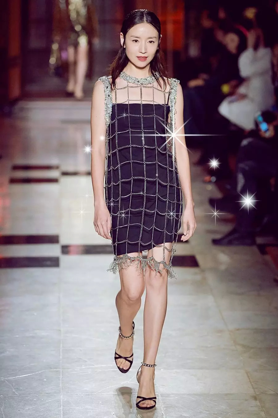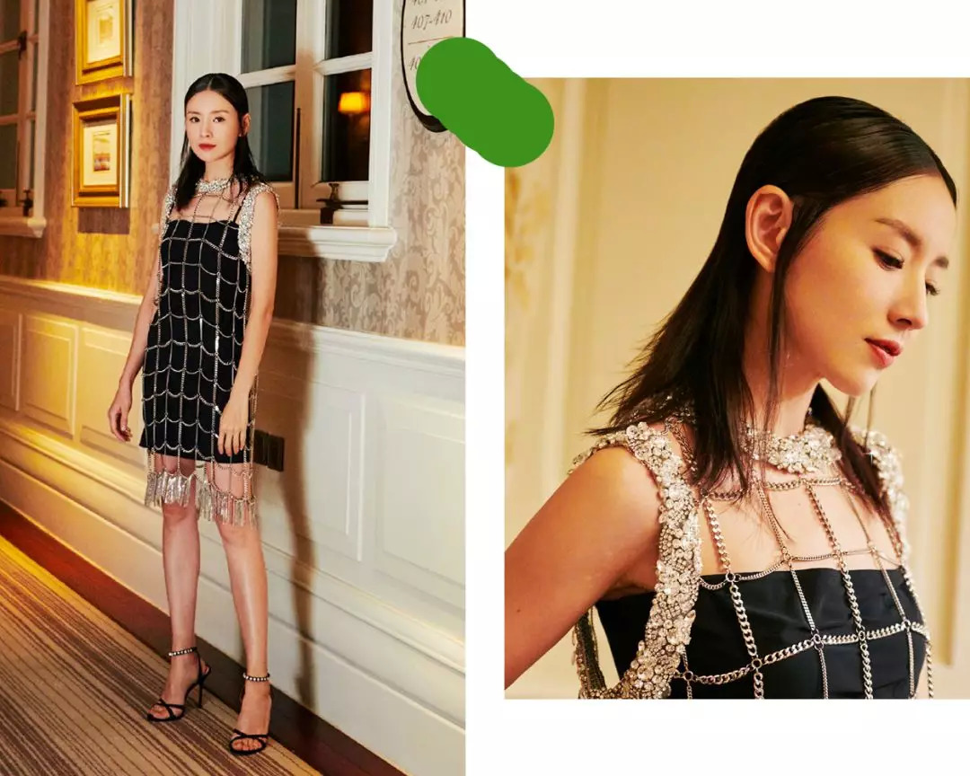 董洁那套镂空镶钻链条背心,在黑色抹胸裙的衬托下更闪了。