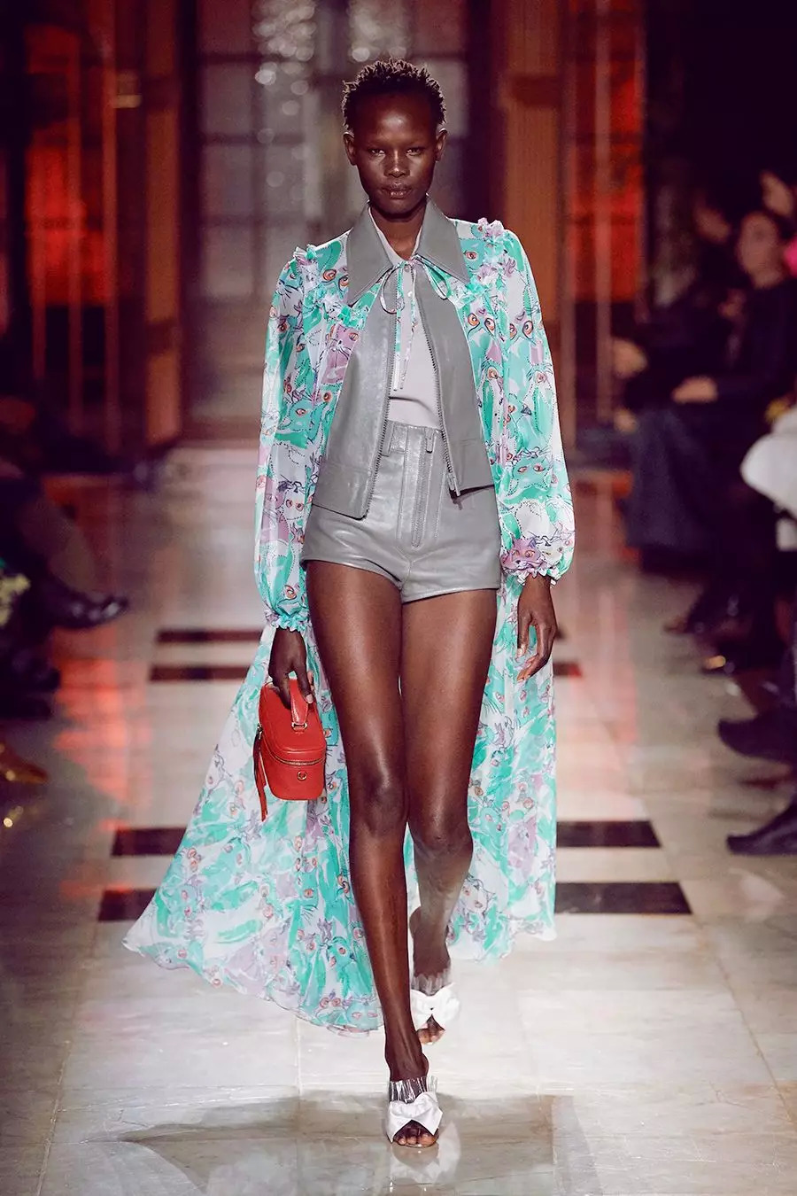创造出紧身运动衫+丝绸V领裙,皮衣+碎花斗篷,这些个很有想象力、天马行空的搭配。