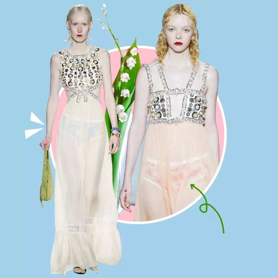 这次最大的亮点就是,哪都能瞧到的半透单品。比如透明纱裙,虽然隐约露出来的碎花内裤是精髓。但如果真有人单穿出去,我一定会追上去跟她握个手的。