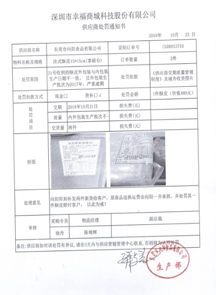 而幸福西饼对界面新闻的回复称,“这是由于供应商操作失误,将外包装箱上标签2018年印成了2017年,从而导致内外日期标签不符问题,该产品并未过期。在2018年10月23日根据《供应商交期质量管理制度》对相关供应商进行了处罚,要求即刻整改,并给予衡水合作商补发2件+1件(补偿)。该批次酥皮并未进入生产环节。”