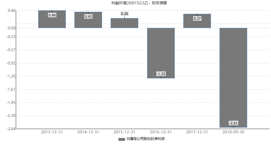 据公司今年以来的财报显示,科融环境的营业收入一直处于下降趋势,环保政策变化、订单减少、公司造血能力不足是造成营收大不如前的主要原因。据科融环境近年来的财务数据显示,公司业绩自2015年经历大幅度下滑后便一蹶不振。如下图所示,2016年科融环境净利润亏损1.32亿元;2017年盈利3700万元,不过光是年初出售房产就使其获得了2192万元的收益;到了2018年,前三季度公司已亏损2.61亿元,同比下滑2889.5%。