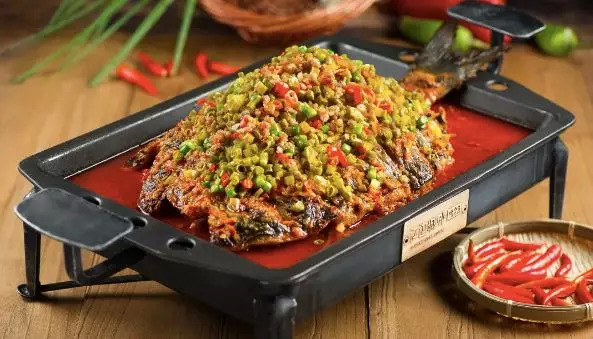 比如之前烤鱼的摆盘不太美观,没法解决,后来一个厨师长设计了款不锈钢的盛架,让辣椒、调料可以装点在鱼上,油也不会全流下去,看着有层次感,颜值一下就提高了。