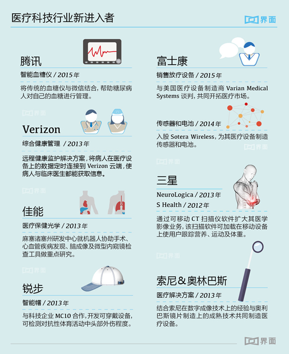 这其中,不乏实力雄厚的外部入侵者。2015年1月21日,腾讯发布外观酷似老年微信手机的“腾爱·糖大夫”,这一医疗智能设备主打血糖检测,虽然没有测量技术上的突破,但跟微信公众号打通,可使用户在微信中管理自己的血糖记录,还能给家人发送健康预警;2015年4月14日,富士康宣布将与美国医疗设备厂商Varian Medical Syste合作,在中国市场销售放疗设备;4月12日,毕马威(KPMG)宣布收购了一家美国医疗咨询公司,这是17个月内毕马威在医疗相关领域第四次出手收购,而IBM也于4月14日宣布已在成立沃森健康项目之前收购了两家医疗科技公司......