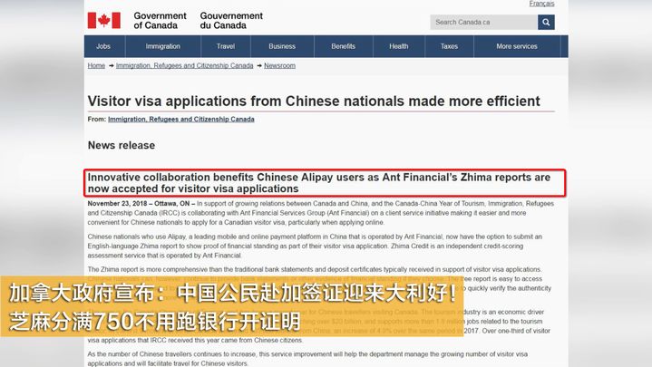 即日起,中国游客办理加拿大签证,芝麻分满750分提交签证报告,可用作财务及履约能力证明,不用再跑银行打印流水单和存款了。