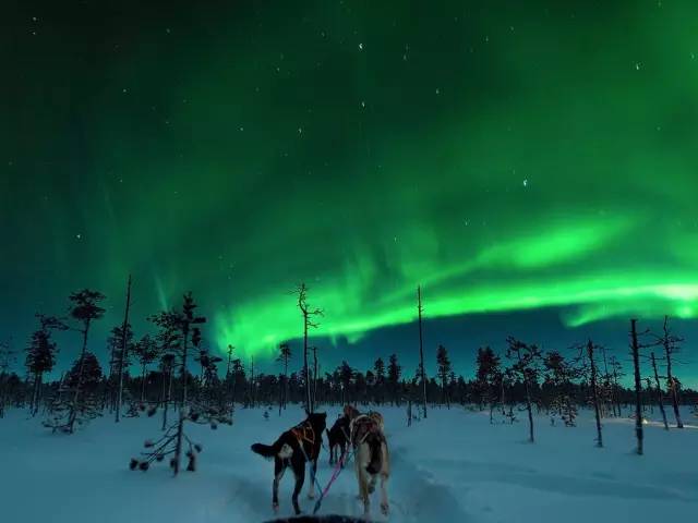 这里的极光不是追来的,而是等来的,你要做的,就是在帐篷里烤着火、喝着热咖啡,等着极光在天空亮起,惊艳你半生的时光。当然,如果等待太过无聊,可以选择当地提供的各种花样追极光的方式。比如,开着越野车,带你远离城区,在没有光污染的野外观赏极光。比如乘坐着狗拉雪橇,去森林小木屋看极光。