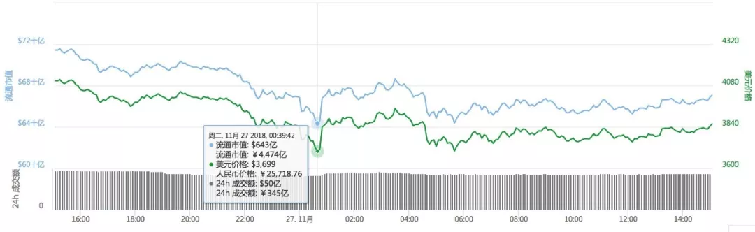 自11月中旬以来,比特币屡屡刷新2017年9月以来的最低水平,带动一波主流加密货币集体下挫。据非小号数据显示,11月14日,比特币报价6417美元。11月25日零时,比特币报价4342美元,当天下午6时左右,比特币价格跌破3625美元。11月27日零时,比特币价格再度跌破3700美元。截至11月27日下午2:00,比特币报价3766美元,24小时下跌6.91%。全球市场总市值24小时下跌75亿美元,交易量收缩近20亿美元。与去年年底的19,299美元相比,比特币已暴跌67%。