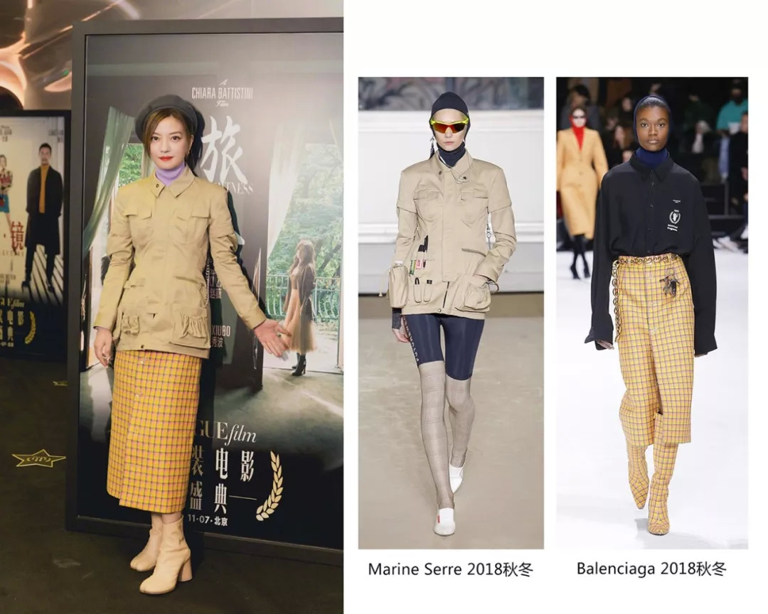 Marine Serre的工装风夹克,混搭Balenciaga的格纹半裙,一身同色系搭配中加以浅紫色做点缀,搭配上藏蓝色贝雷帽增加细节,可以说是超有想法的一搭了。