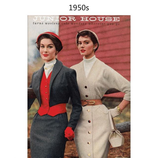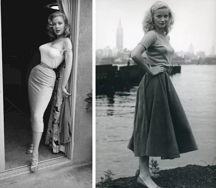 就像前面提到的,50年代是个疯狂迷恋纤细腰身的时代。那个时期的女人们尤其热衷于用铅笔裙和大摆A裙来凸显自己的腰线。