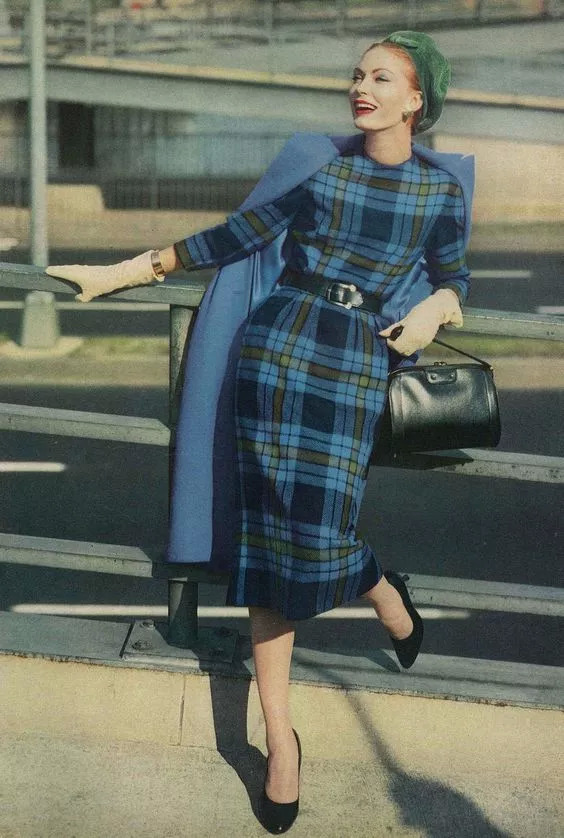 《Vogue》1957年9月刊上就有出现过一身蓝色大衣+蓝色格纹裙的look,搭配上纤细的腰肢和墨绿色贝雷帽,真真是有把饼给迷到!