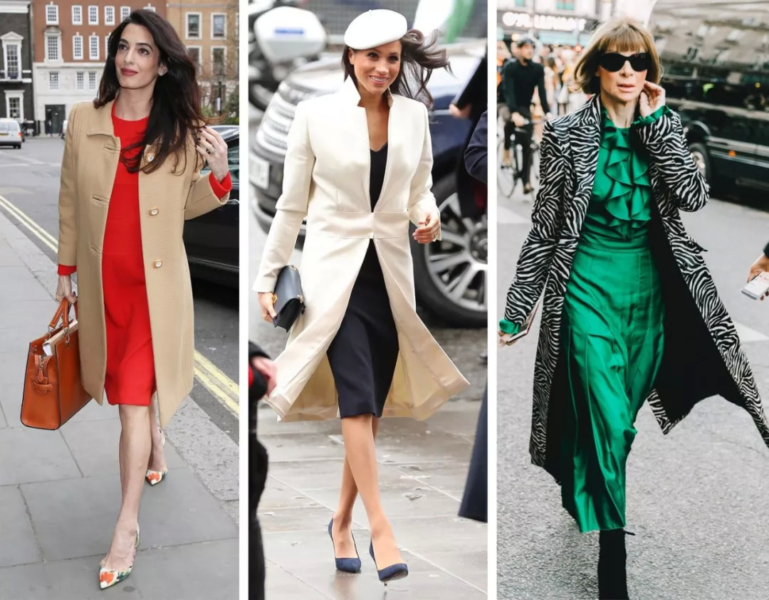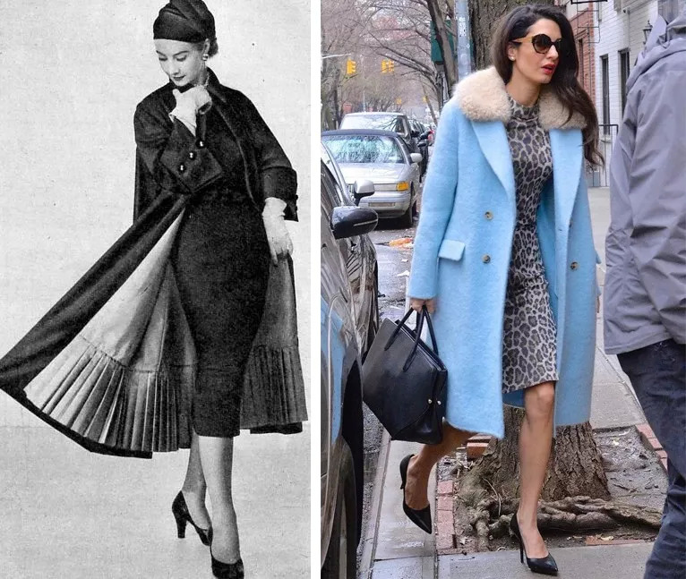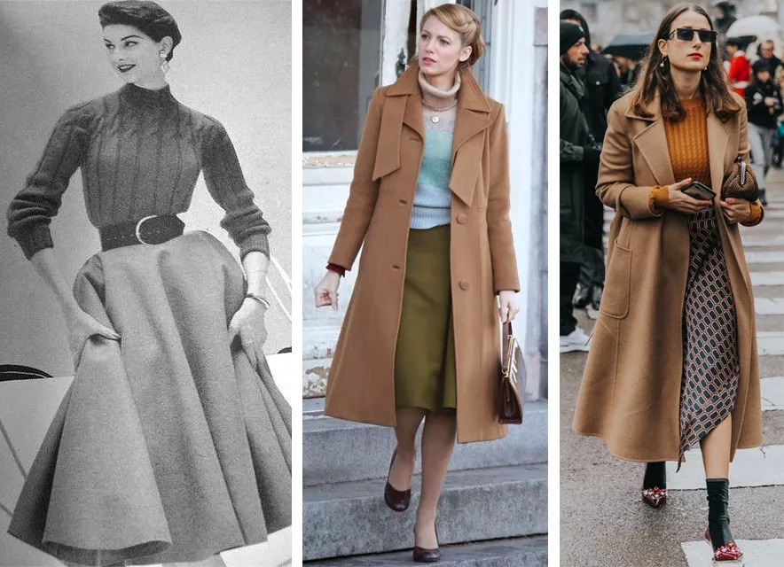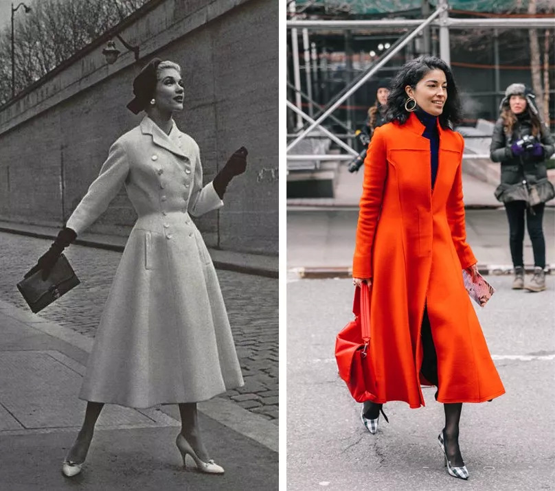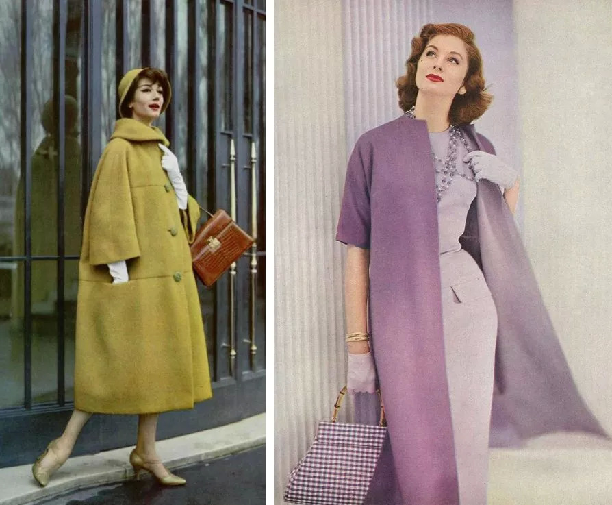 那个年代追求纤细的腰身和优雅女人味,因此收腰连衣裙+A型大衣是最常见的组合。