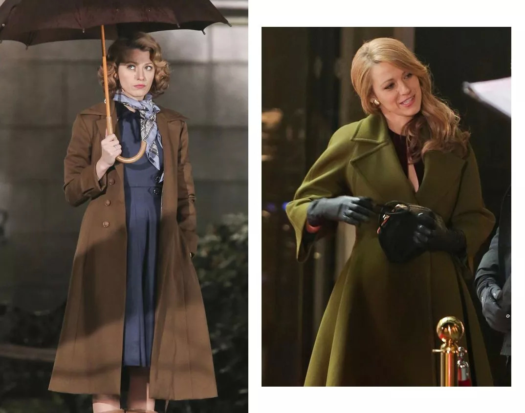 后来Queen S在电影《时光尽头的恋人》中,也有贡献过不少这一经典look。但她的人物更爱强调腰线,大衣和连衣裙都做了收腰设计。