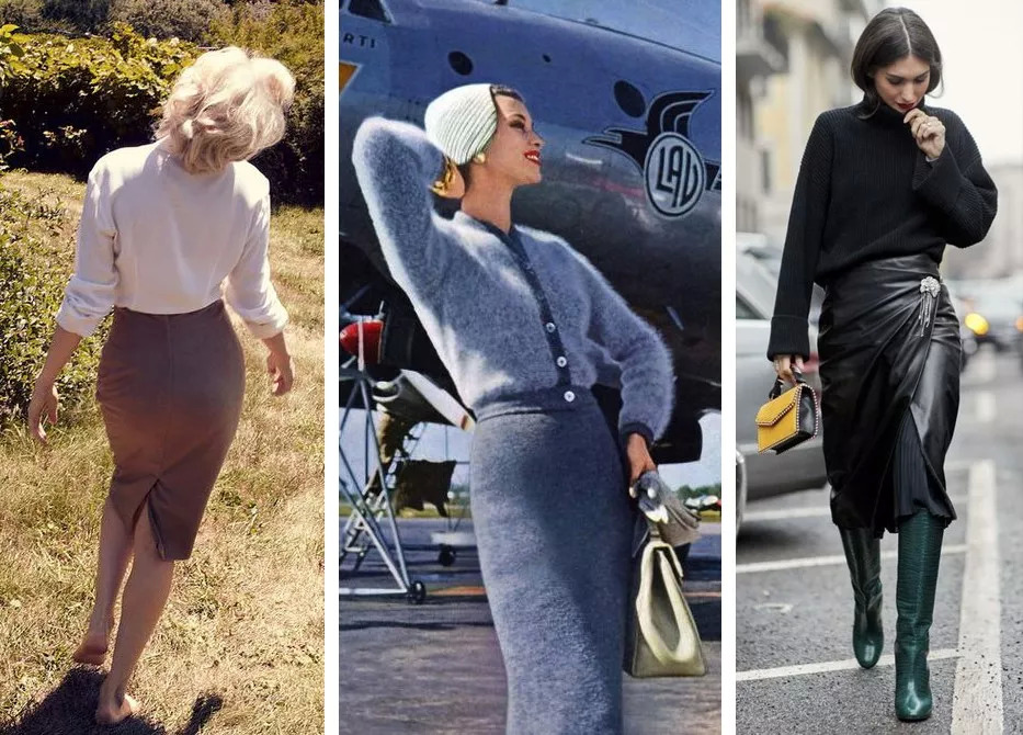 时代美人梦露就是个铅笔裙爱好者,针织衫+铅笔裙的look在她的生活中非常常见。