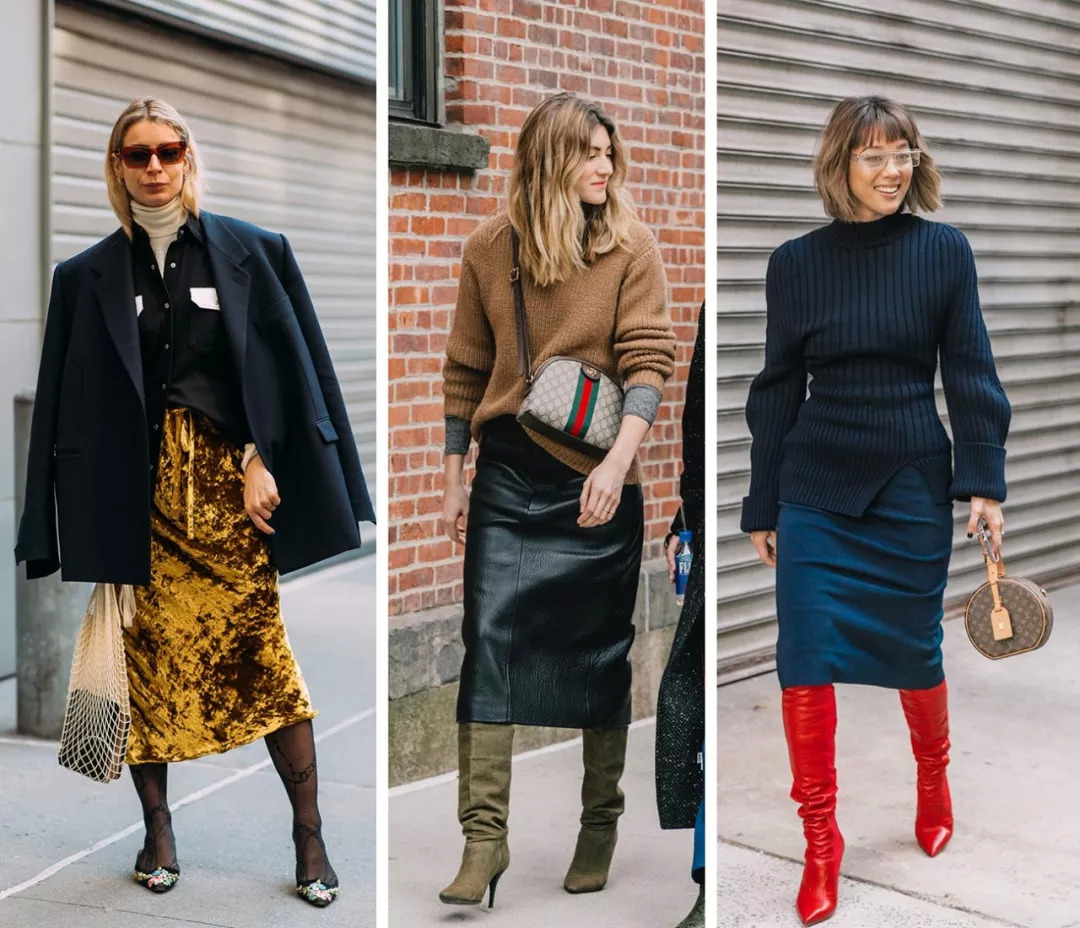 追求自由的现代女性也更热衷于不被太紧身的铅笔裙束缚住,在搭配上宽松毛衣只塞衣角的look开始普遍。