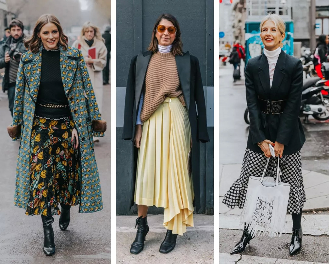 针织衫+A裙除了可以搭配大衣外,搭配西装或是混搭高领衫的方式,都可以成为这一搭的革新。