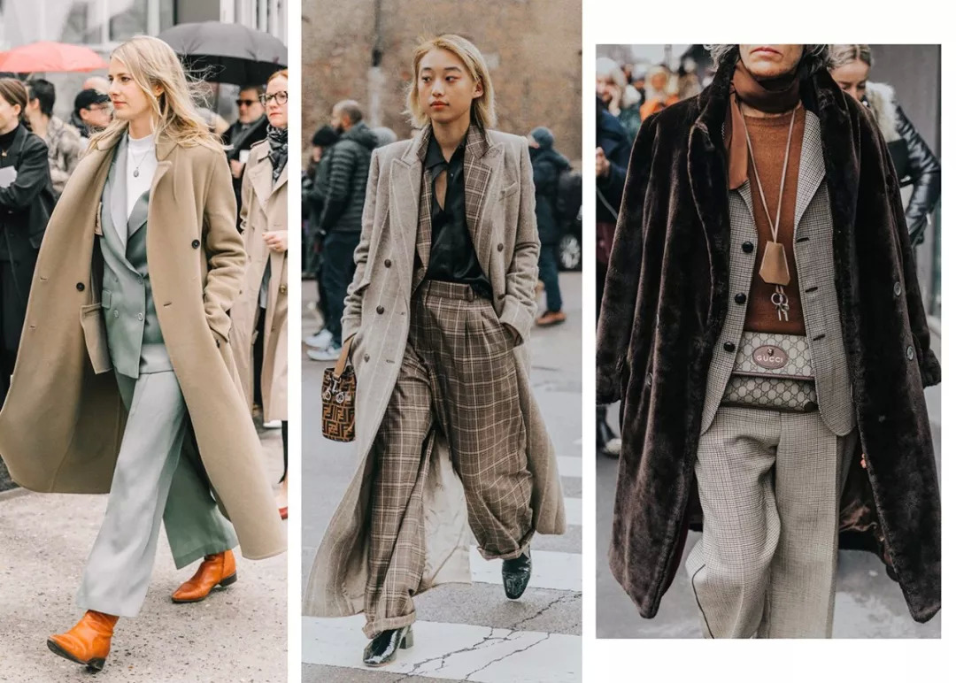 现代街拍中,西装套装也不单只作为外套而存在,它还可以成为大衣、仿皮草等大件的内搭。这样的搭配可以为你更增添大气场。
