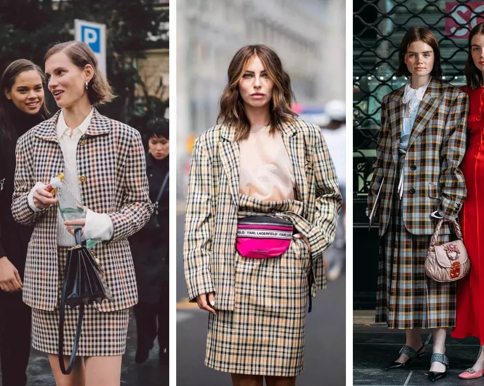 现代街拍中格纹套裙也依旧很时髦。搭短裙可以通勤又减龄,搭中长裙可以复古又精致。