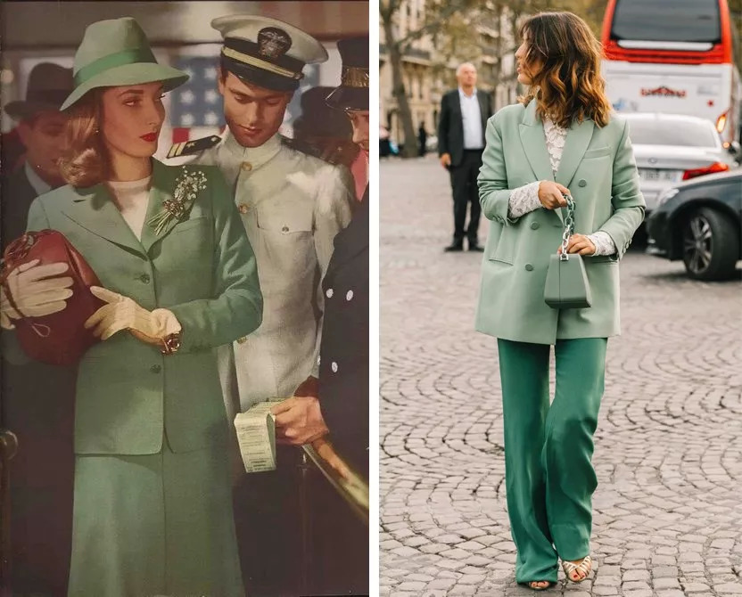 40年代老画报中流传下来的这身绿色西装套装+绿色帽子的look,后来也被Jeanne拿出来效仿过。
