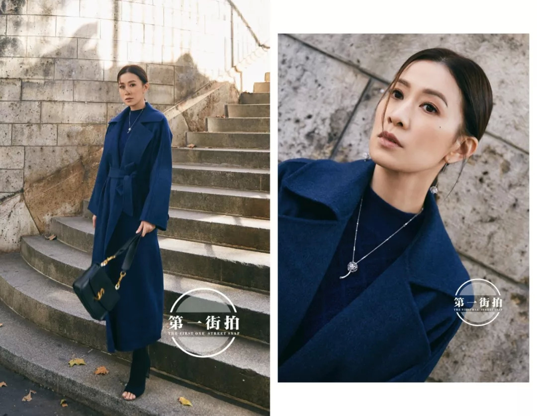阿佘前阵子在街拍中穿了一身藏蓝色大衣+藏蓝色针织衫,点缀上精致的铂金首饰,从容而优雅,完全值得轻熟姑娘copy起来。
