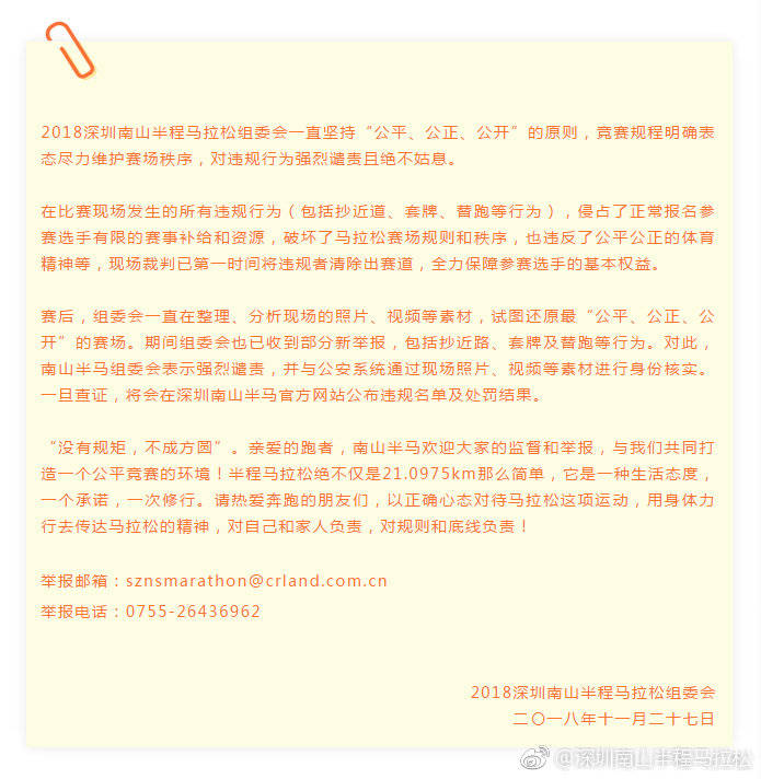 @深圳南山半程马拉松消息,2018华润深圳南山半程马拉松赛结束后,组委会收到一些关于比赛期间违规行为的报告,对此,我们深感遗憾。马拉松赛不止是一场奔跑,更是人生的修行;每位选手都应对自己的行为负责, 对体育精神和赛事制度负责。今日,组委会特发声明,将严查一切违规行为,绝不姑息 !