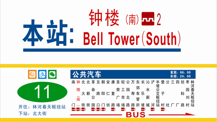 在规范公交站名的同时,对灯箱站牌版面也进行重新设计,新版面在原有内容的基础上又新增加了五项内容(英文站名、换乘地铁标识、乘车支付标识、冬夏季车辆运行具体时间、车辆行驶方向识别标)。具体如下: