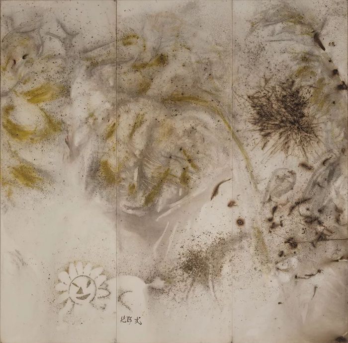 蔡国强早年在日本发展,而今和日本文化艺术界依然关系密切,在展厅里一幅作品上面,藏着北野武签名的一个笑脸。