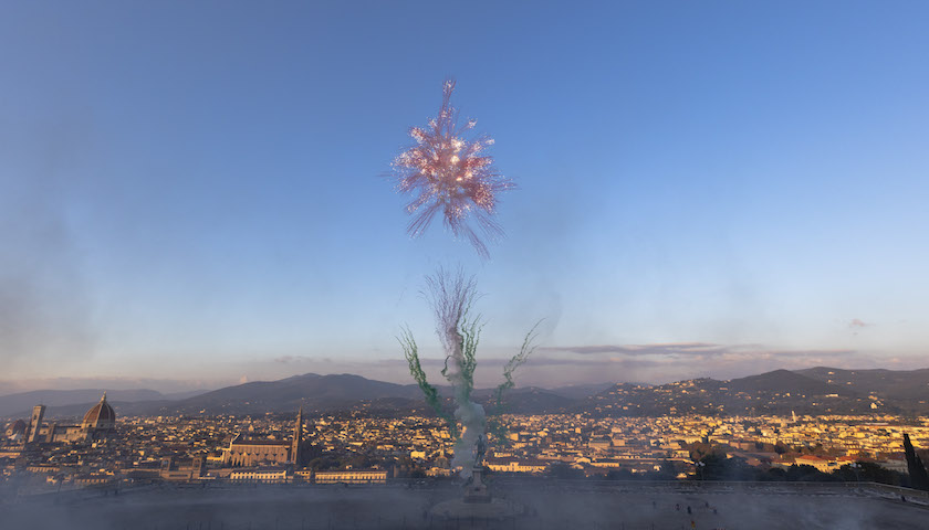 当被问及“时至今日,文艺复兴对于当下人们还有怎样的意义”和“焰火和展览的主题‘空中花城’和‘花曲’背后的深意”时,蔡国强说:“我希望把文艺复兴先辈的灵魂带到城市上空。波提切利的画现在成了名作,游客排很多小时的队,看一眼,然后就走过去了。现在这里(美术馆)变成了游客的地方,市民们不会进来。游客带来了GDP,但他们的城市变成了过去文化的墓地……我希望把这里的花草拿出来,献给城里的人。希望这些大师,不仅活在美术馆冰冷的墙面,也生活在街道中、城市里,就像他们当年那样。”