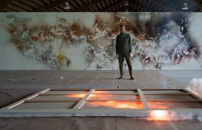 伴随着这份心境的转变,他也开始使用彩色火药进行创作。“(上世纪)80年代,我在日本用过一些彩色火药。那个时候,我不好色,对于色彩没有那么敏感,当时我喜欢黑色,觉得更纯粹。这几年,因为家庭的变化和我自己的变化,对于色彩的表现开始有感觉了。”