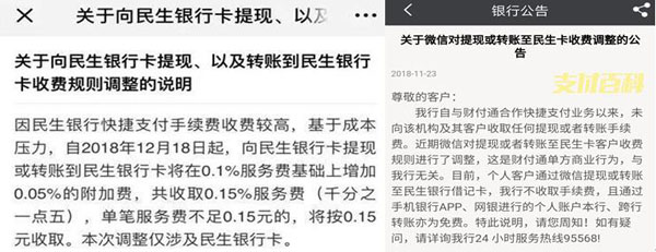 近日,微信一则公告引发人们热议,公告称,因民生银行快捷支付手续费收费较高,基于成本压力,自2018年12月18日起,向民生银行卡提现或转账到民生银行卡将在0.1%的服务费基础上增加0.05%的附加费,共收取0.15%服务费(千分之一点五),单笔服务费不足0.15元的,将按0.15元收取。本次调整仅涉及民生银行卡。