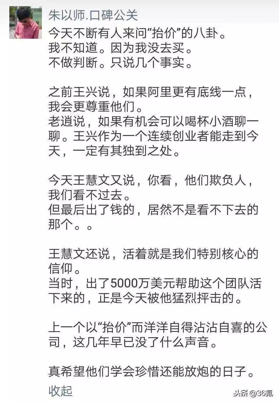 11月22日,美团的王慧文在接受36氪专访时提到,当初阿里收购饿了么,美团曾经帮忙抬价,在互联网圈成为一大笑谈。但是在采访过后,该言论迅速引起了阿里公关的强烈反弹,阿里方面直接怒斥美团“珍惜还能放炮的日子”。